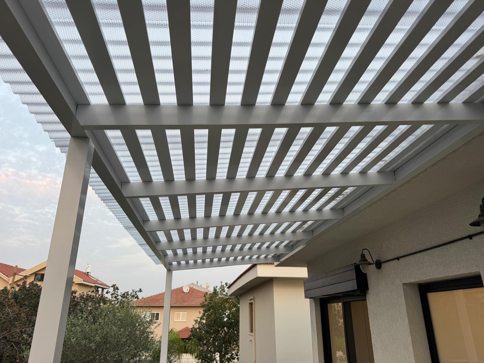 הקירוי מונע חדירת גשם ומאפשר שימוש בשטח גם בימי חורף, תוך שמירה על אוורור טבעי והצללה איכותית בקיץ.
